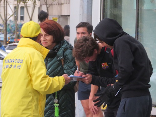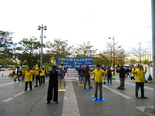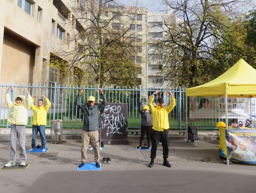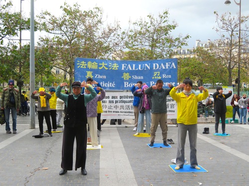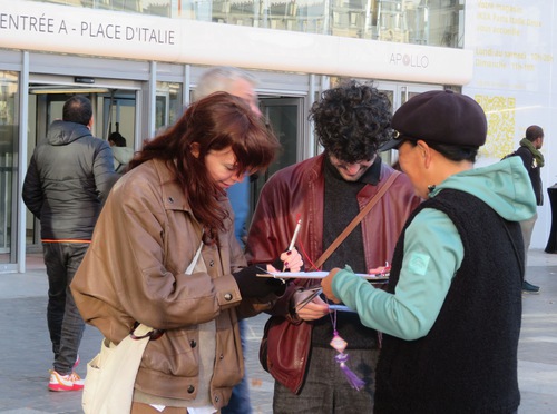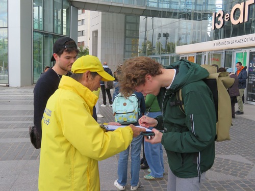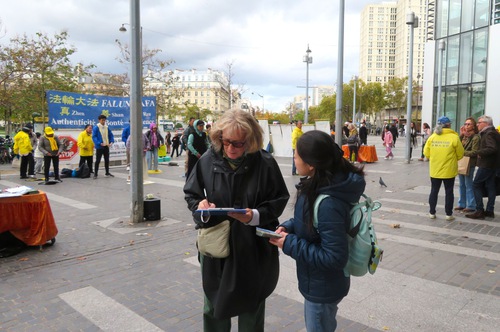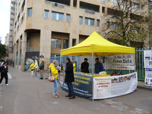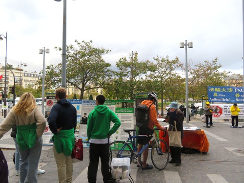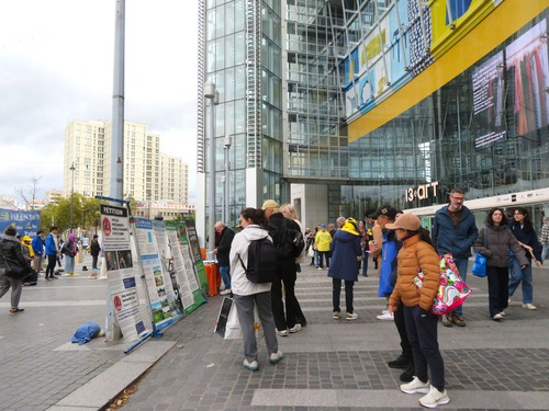 Situada en el distrito 13 de París, la Plaza de Italia se encuentra en un gran centro comercial, con el edificio del gobierno del distrito al otro lado de la plaza. Los practicantes instalaron un puesto frente al centro comercial el sábado 25 de octubre. Las personas que observaron la demostración de los cinco ejercicios de Falun Dafa se enteraron de que el Partido Comunista Chino (PCCh) persigue a quienes siguen los principios de Verdad, Benevolencia y Tolerancia en China. También se les informó sobre la sustracción forzada de órganos a prisioneros de conciencia, avalada por el estado del PCCh. Consternados e indignados por las atrocidades, muchos firmaron la petición que exigía el fin de la persecución.