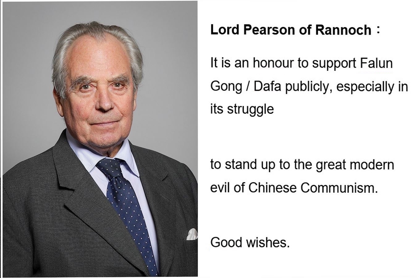Lord Pearson de Rannoch escribió: "Es un honor apoyar públicamente a Falung Gong/Dafa, especialmente en su lucha para plantar cara al gran mal moderno del comunismo chino".
