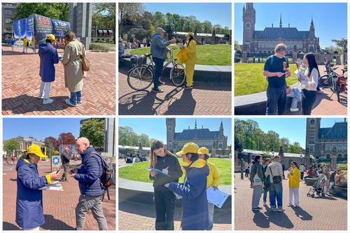 En la tarde del 25 de abril, los turistas en el centro de La Haya y el Palacio de la Paz hablaron con los practicantes y firmaron una petición.