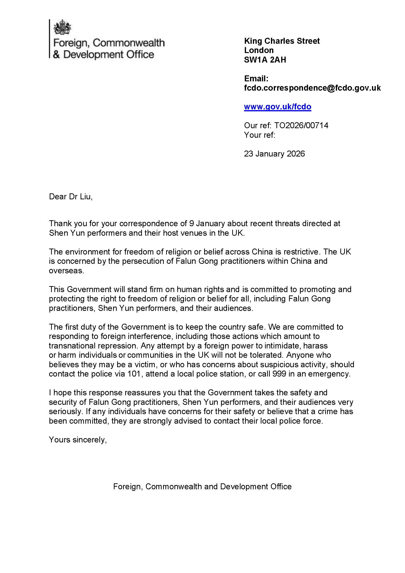 La Asociación de Falun Dafa del Reino Unido escribió posteriormente al gobierno británico y al departamento correspondiente en relación con la serie de amenazas. El Ministerio de Asuntos Exteriores, de la Commonwealth y de Desarrollo envió una respuesta formal el 23 de enero, expresando su firme apoyo a Falun Dafa y Shen Yun Performing Arts.