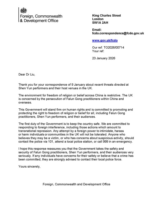 (Minghui.org) La Asociación de Falun Dafa del Reino Unido recibió una carta de apoyo del Ministerio de Asuntos Exteriores, de la Commonwealth y de Desarrollo (FCDO) el 23 de enero de 2026 en respuesta a las amenazas contra la gira británica de Shen Yun Performing Arts en 2026. Las amenazas parecen provenir de agentes del Partido Comunista Chino (PCCh) y son intentos de sembrar desinformación e impedir que Shen Yun actúe en el Reino Unido.